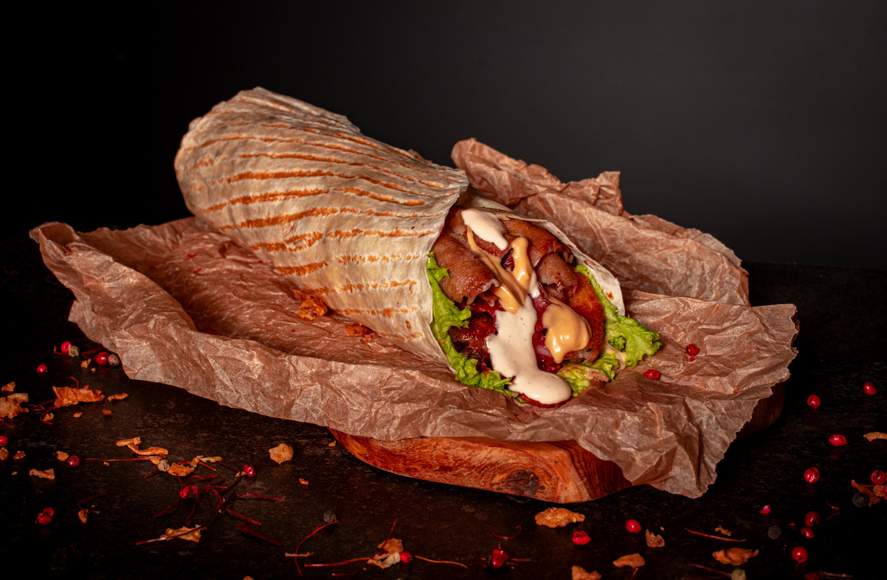 Grillowana Czarna bułka, mięso, pomidory, pikle, chrupiący bekon, sałata lodowa, gorący sos serowy, pikle, jalapeno, czarny sezam, prażona cebulka, autorskie sosy